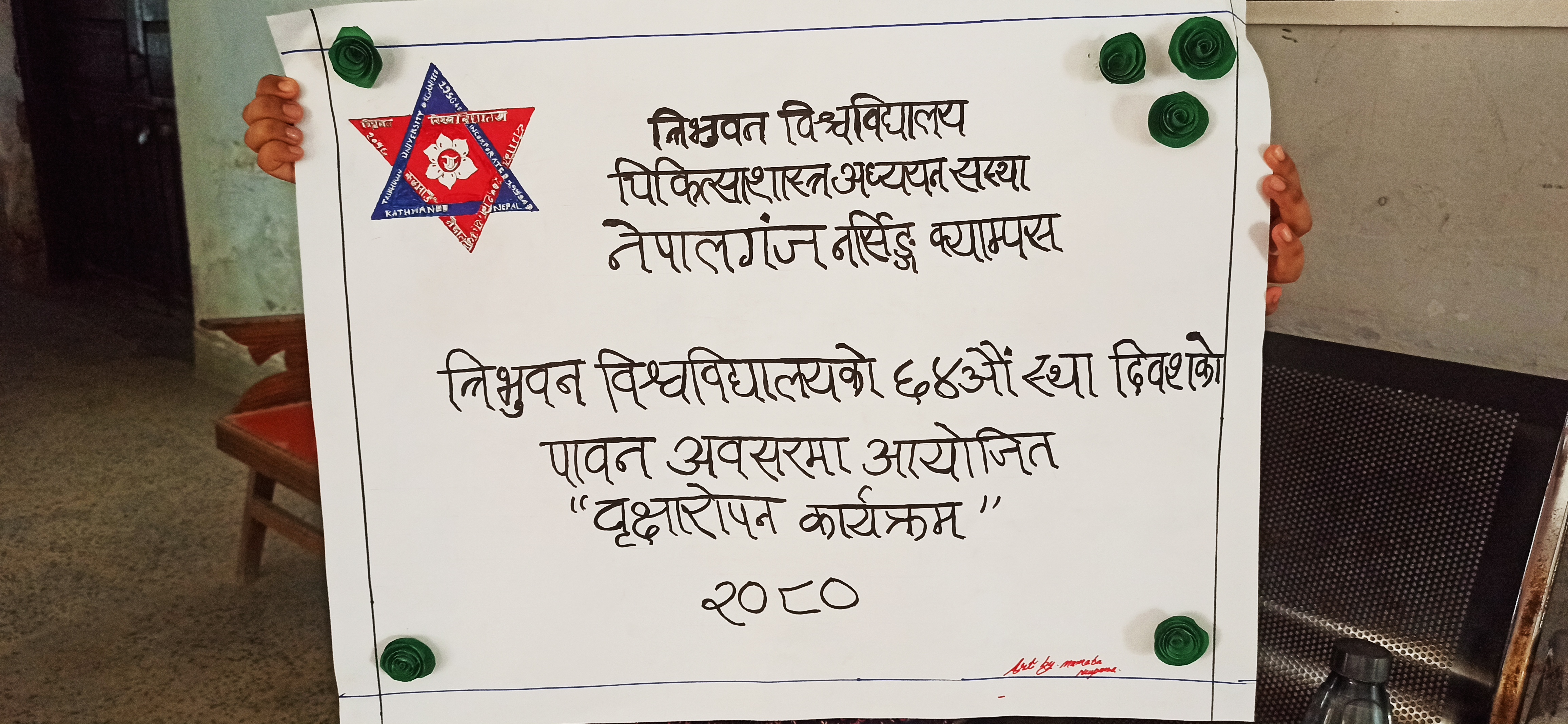 अषाढ १२ मंगलबार त्रिभुवन विश्वविद्यालयको स्थापना दिवसकै दिन बिहान ७:०० बजे देखि क्याम्पस परिसर भित्र शिक्षक, कर्मचारी तथा विद्यार्थीहरूको उपस्थितिमा १०० भन्दा बढी विभिन्न प्रजातिका फुल तथा बोटबिरुवाहरू रोपी भव्यताकासाथ वृक्षारोपण कार्यक्रम सम्पन्न गरियो | नेपालगंज नर्सिङ्ग क्याम्पसका क्याम्पस प्रमुख श्री तुलसा सुनारले संयुक्त रूपमा विरुवा रोपी उक्त कार्यक्रमको उद्घाटन गर्नु भएको थियो|
