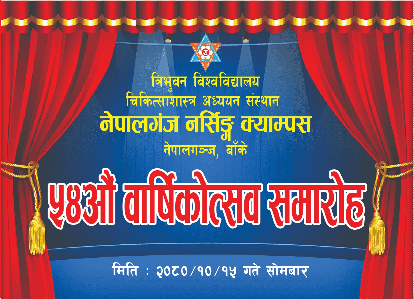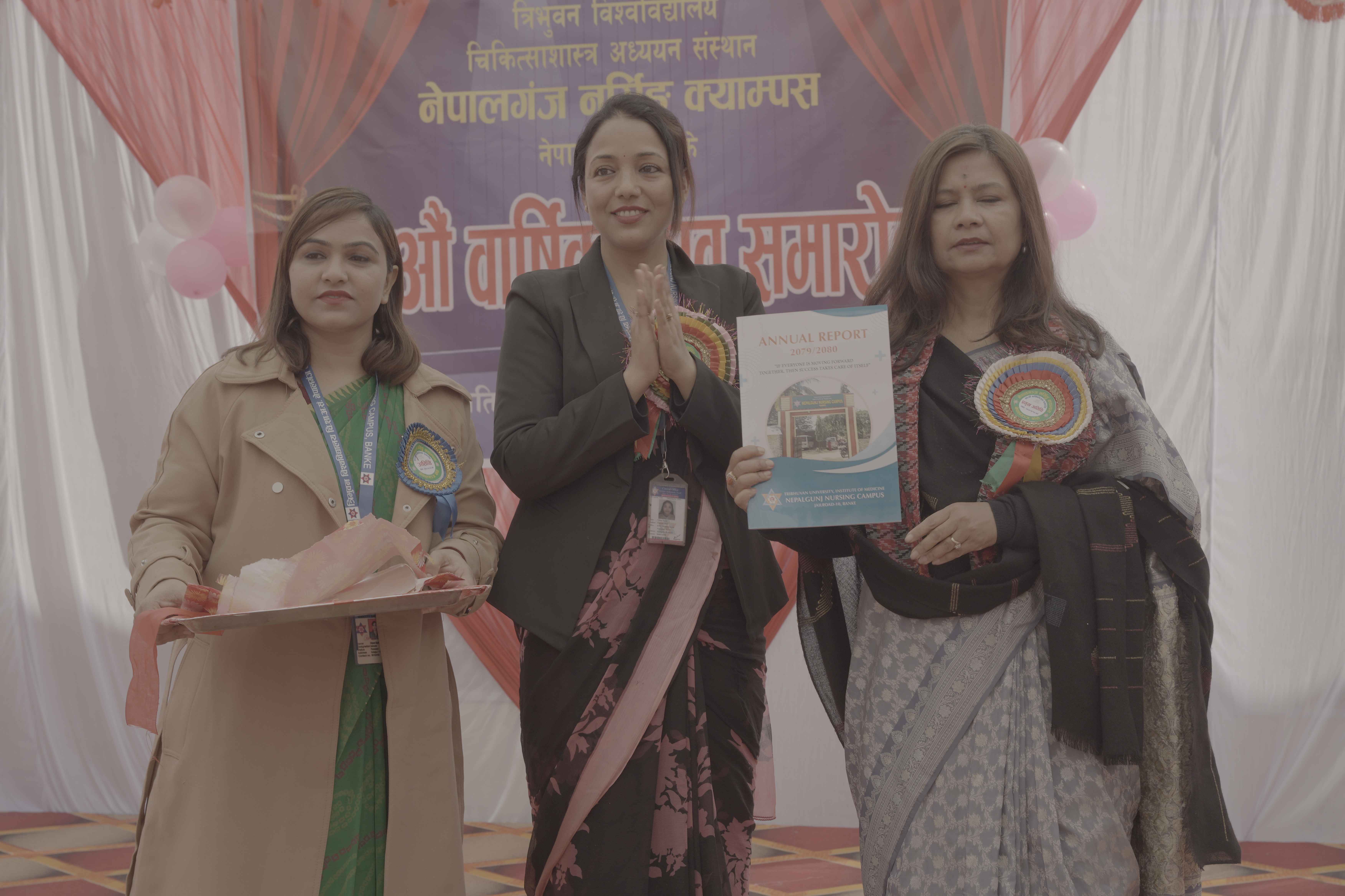 त्रिभुवन विश्वविद्यालय चिकित्साशास्त्र अध्ययन संस्थान नेपालगंज नर्सिङ्ग क्याम्पसले प्रथम पटक आफ्नो ५४ स्थानपन दीवस मनाएको छ सो बार्षिक उत्सवका आवसरमा त्रिभुवन विश्वविद्यालय चिकित्साशास्त्र अध्ययन संस्थानका डीन प्रा.डा दिव्यासिंह शाहको प्रमुख आतिथ्य तथा सहायक डीन प्राध्यापक तक्मा के.सी.,भेरी अस्पतालका प्रमुख डा पवन रायमाझी , श्री दुर्गालक्ष्मी श्रेष्ठ ,प्रमुख अस्पताल नर्सिग प्रशासक भेरी अस्पताल तथा नेपालनगंज नगरपालीका स्वास्थ्य शाखा प्रमुख चन्द लगायतको उपस्थिती र क्याम्पस प्रमुख श्री तुलसा सुनारको अध्यक्षतामा उक्त बार्षिक उत्सव समारोह मनाईएको थियो चिकित्साशास्त्र अध्ययन संस्थानकी डीन प्रा.डा दीव्यासिंह शाहले नेपालगंज नर्सिगं क्याम्पसलाई आफुले सक्दो सहायोग गर्न प्रतिवद्धता राख्नु भएको थियो भने सहायक डीन प्रा. तक्मा के सी यस क्याम्पसको बारे थप योजना बनाई अगाडी बढाउने र पक्कै पनि आगामी दिनमा राम्रो हुनेछ भन्ने मन्तव्य राख्नु भयो , क्याम्पस प्रमुख सुनारले वर्ष भरि गरेको कार्य र भएका प्रगतिको बारेमा संक्षिप्त जानकारी प्रस्तुत गर्नु भयो भने बार्षिक प्रतिवेदनको डीनले विमोचन समेत गर्नु भएको थियो सो कार्यक्रममा स्वागत मन्तव्य उप प्रा सुनिता आचार्यले र नर्सिड पेशाको चुनौति र अवसर बारे श्री दुर्गालक्ष्मी श्रेष्ठले र नेपाल नर्सिङ संघ बाँकेकि अध्यक्ष लक्ष्मी के सी ले आफ्ना भनाईराख्नु भएको थियो भने उक्त कार्यक्रममा धेरै वर्ष सेवा गरेका एकजना कर्मचारी जो पैकराम पासी र शिक्षक सरस्वती पि.सी लाई दोसल्ला र सम्मान पत्र प्रदान गरिएको थियो । क्याम्पसमा वर्षभरि गरेका विभिन्न खेलकुदमा भएका प्रतियोगिताको विभिन्न विदामा जित्ने खलाडीलाई पुरस्कार वितरण तथा सांस्कृतिका कार्यक्रम संचालन गरि बार्षिक उत्सव सम्पन्न भयो साथै उक्ते संचालन उप प्रा रेखा खड्का र प्रशासन सहायक भद्र थापाले गर्नु भएको थियो ।