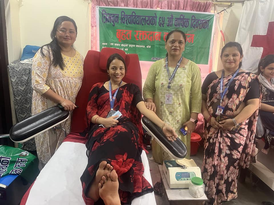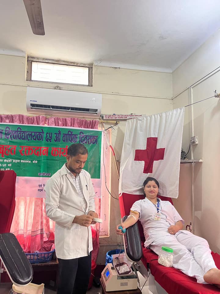 त्रिभुवन बिश्व बिध्यालयको ६५औ स्थापना दिबसको अबसरमा नेपालगन्ज नर्सिङ क्याम्पस परिसरमा सप्ताहव्यापी सरसफाई, क्याम्पसको पूर्व विद्यार्थी तदर्थ समिति तथा स्वतन्त्र विद्यार्थी युनियन र क्याम्पसको संयुक्त आयोजनामा मिति २०८१/०३/२८ गते वृहत रक्तदान कार्यक्रम, २०८१-३-३० गते दिप प्रज्वलन, २०८१-३-३१ गते बृक्षारोपन लगायतका कार्यक्रम गरी भब्य रुपले सप्ताहव्यापी कार्यक्रम सम्पन्न गरिएको छ। कार्यक्रममा क्याम्पस प्रमुख, शिक्षक, कर्मचारी तथा स्व.वि.यु. का साथै सम्पूर्ण BNS र B.Sc. Nursing का विद्यार्थीहरुको सहभागिता रहेको थियो |