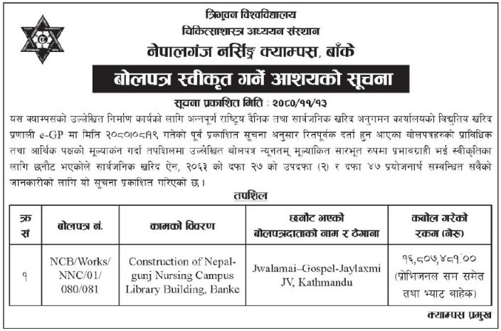 बोलपत्र स्वीकृत गर्ने आशयको सूचना |