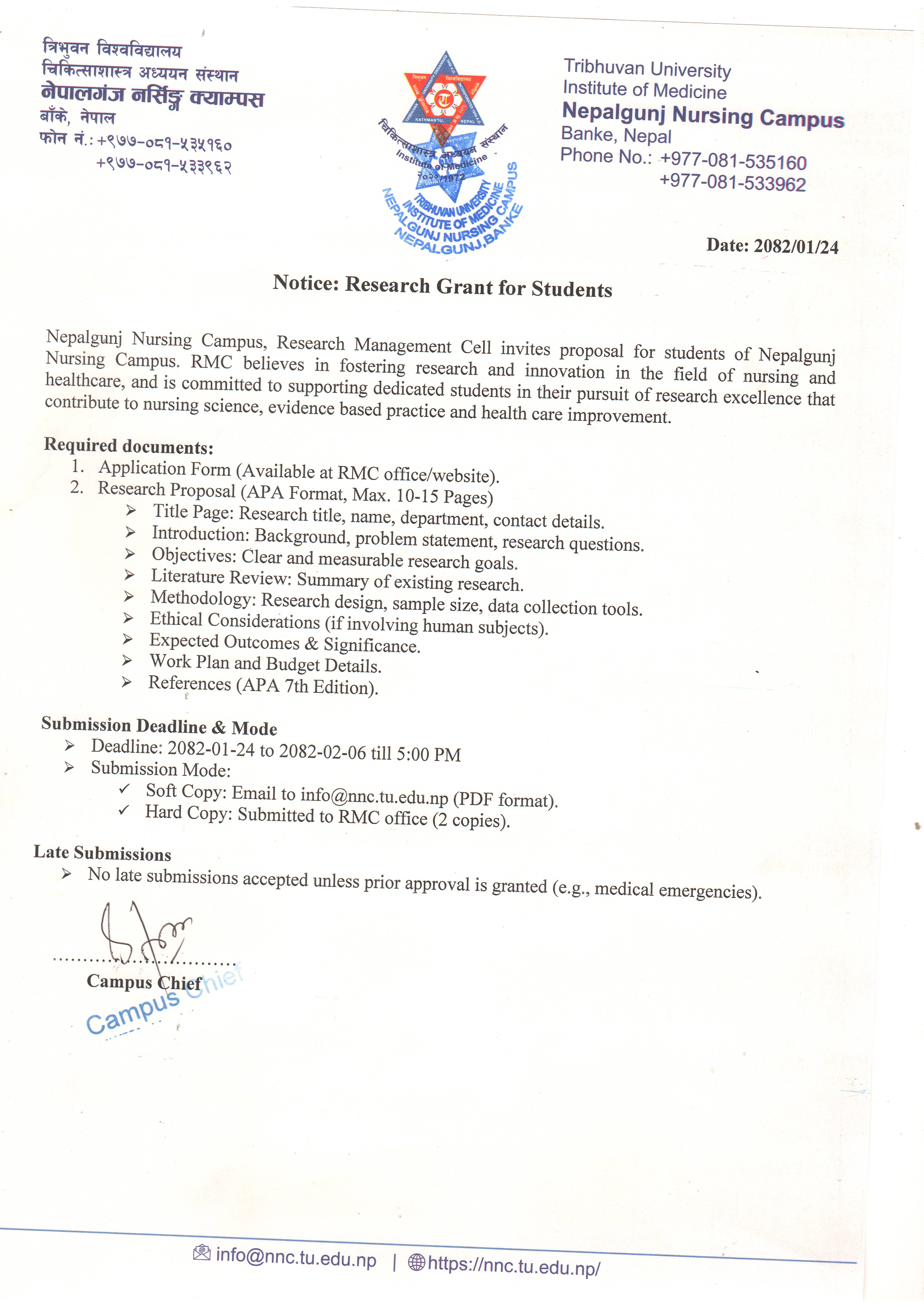 Research Grant नतिजा सम्बन्धी सूचना |