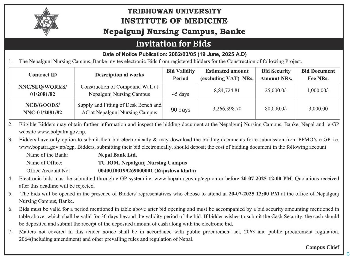 Invitation of Bids (Construction of Compound Wall and Supply & fitting of Desk Bech & AC)