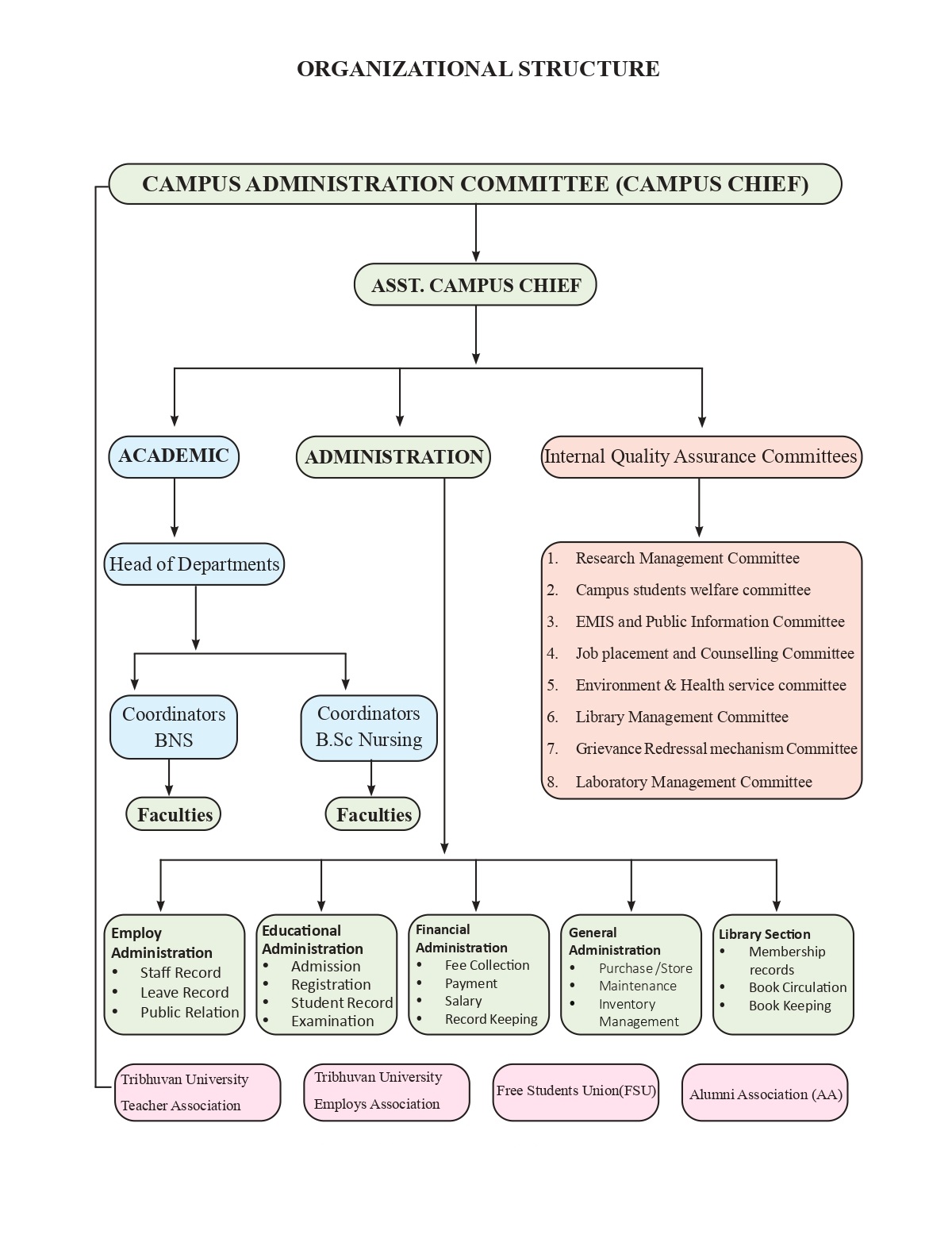 The organizational chart of Nepalgunj Nursing Campus below identifies the positions within the campus governance structure.
